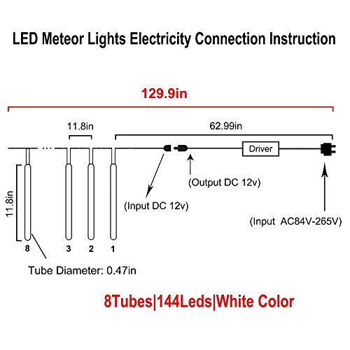 - Each tube length: 11.8inch/ 30cm; tube quantity: 8 tubes; 18LED bulbs of per tube; number of LED bulbs: 8 tubes x 18LED (144LED Lights). US plug; Voltage: 110V-220V, Watt: 5W.