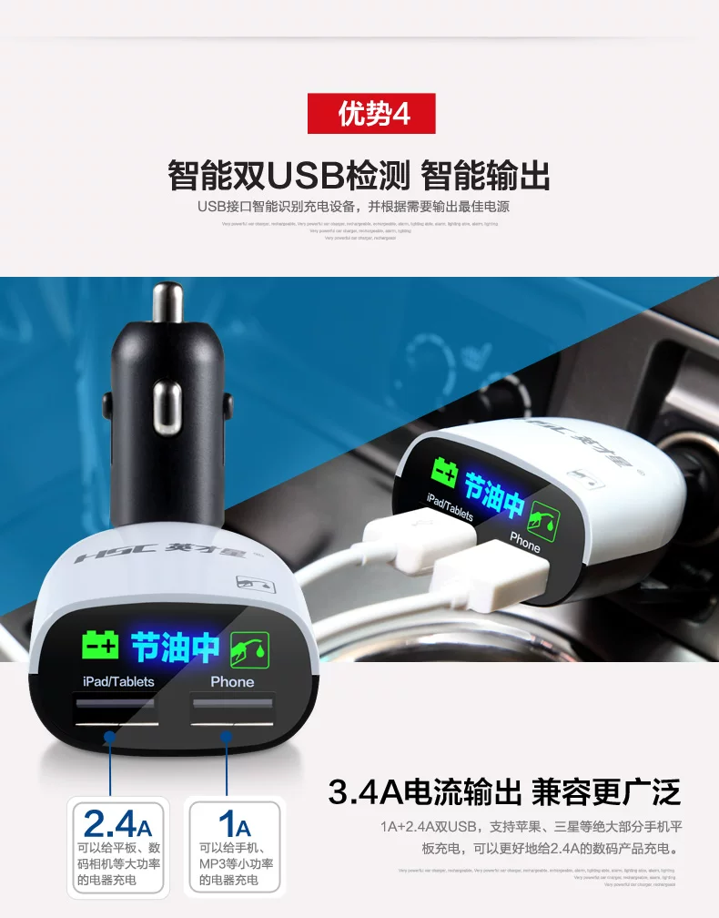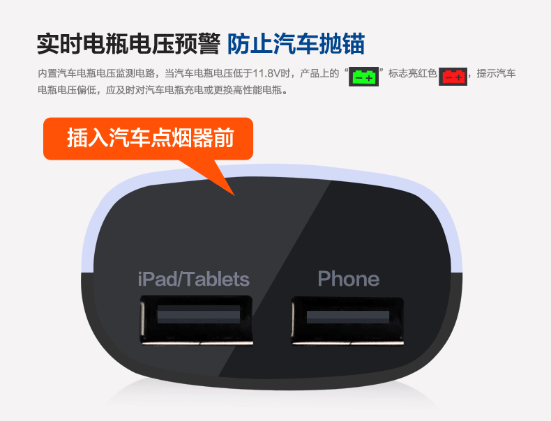 1, save fuel, enhance the power; 2, intelligent dual USB charging detection, intelligent output; 3, battery voltage alert, to prevent the car broke down; 4, stable starting voltage.