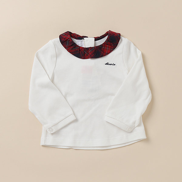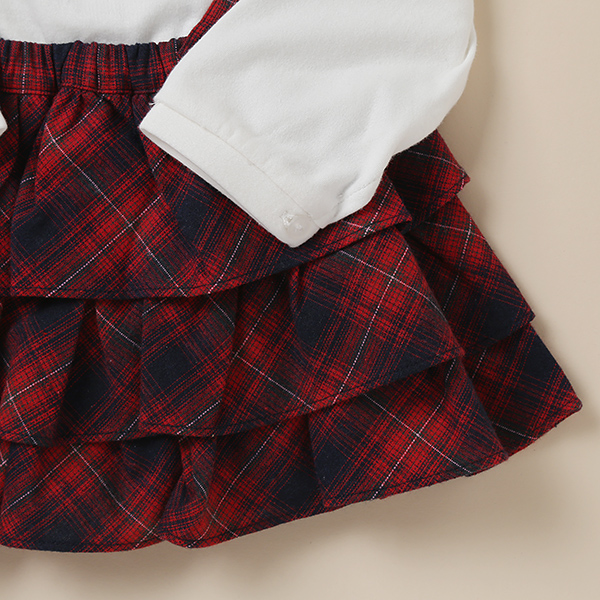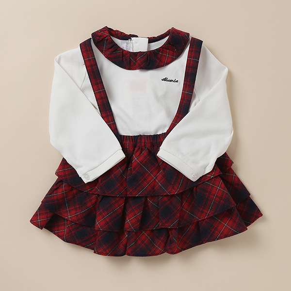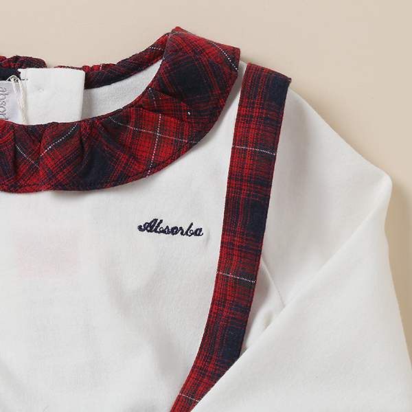 부드러운 양면 티셔츠에 레드 체크지 멜빵 스커트로 포인트를 준 스커트상하복입니다