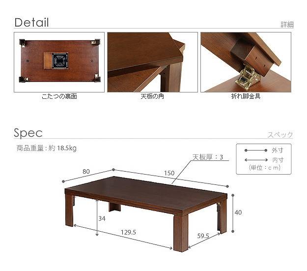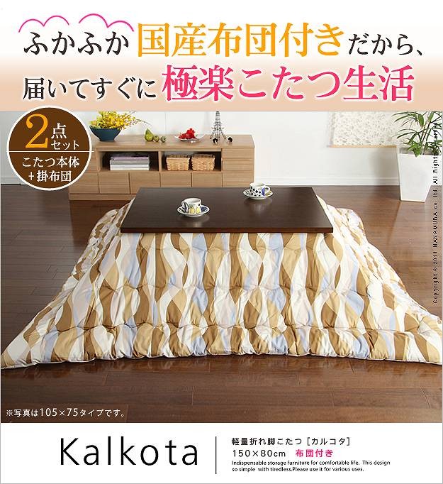 サイズ(cm):こたつ-幅150x奥行75x高さ40・約18.5kg、布団-幅205x奥行285・約2.8kg