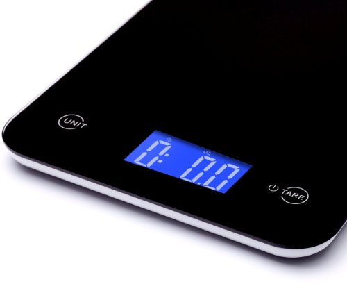 - Features advanced touch sensitive buttons for easy operation, and a large Blue Backlit LCD screen that displays weights in pounds, kilograms, grams, and ounces (lb/oz, kg/g, fl.oz., ml)
