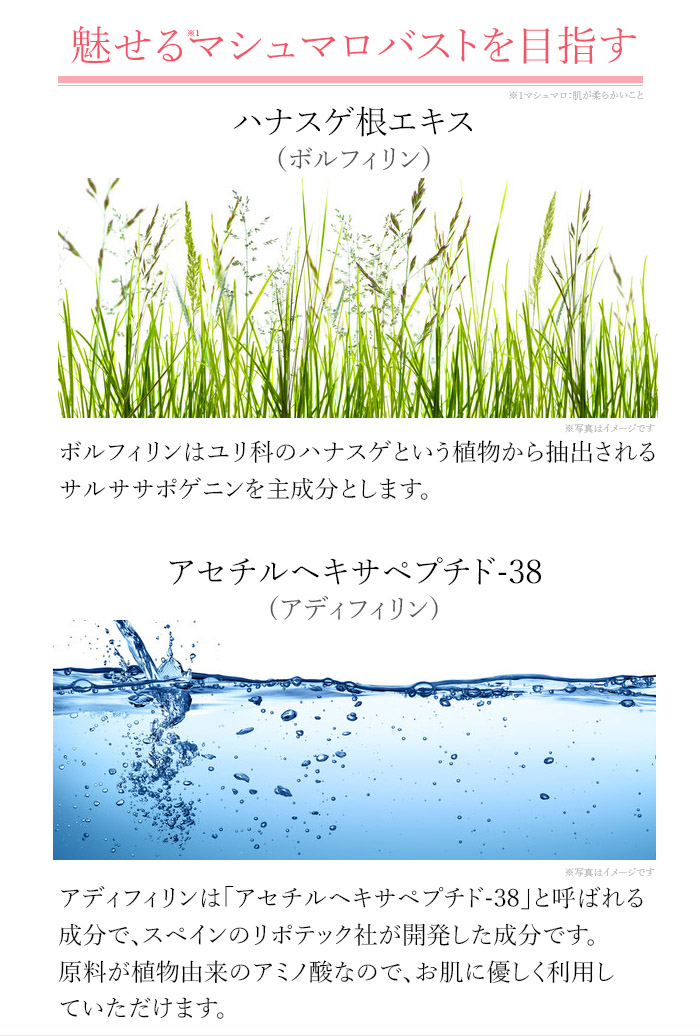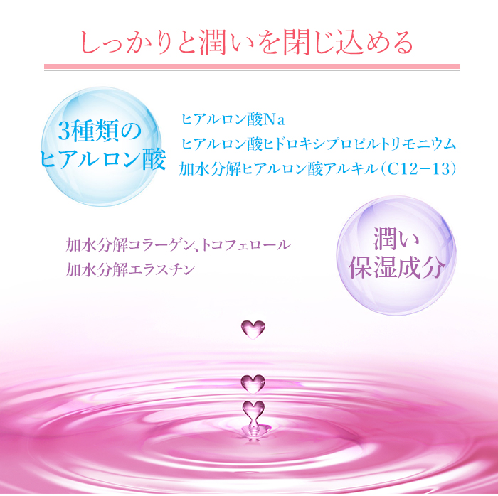 原材料名 水、BG、グリセリン、ハナスゲ根エキス、アセチルヘキサペプチド-38、ザクロ花エキス、ダイズ種子エキス、加水分解エラスチン、メロン胎座エキス、ヒアルロン酸Na、ヒアルロン酸ヒドロキシプロピルトリモニウム、加水分解ヒアルロン酸アルキル(C12-13)グリセリル、加水分解コラーゲン、水添ポリイソブテン、トコフェロール、PEG-40水添ヒマシ油、(アクリレーツ/アクリル酸アルキル(C10-30))クロスポリマー、アルギニン、キサンタンガム、水酸化K、酸化銀、フィチン酸、フェノキシエタノール、香料、赤106