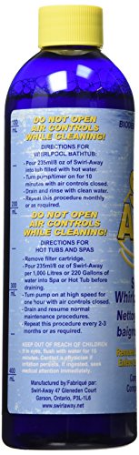 -. Feature : Swirl away plumbing cleaner / Removes dirt, oil and other build-up in the plumbing lines that impede jet action / Use this product P.R.Ior to draining the spa to maintain the ultimate hydrotherapy experience