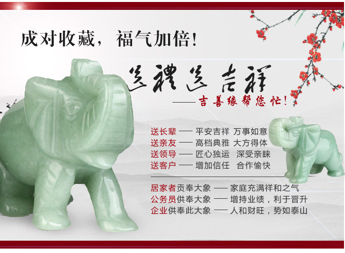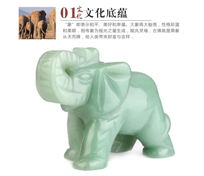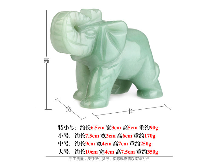 Product features: "Like"?that?peace,?beauty and happiness.?The elephant?High?Da Kui?Wu,the character is?moderate flexibility,?according to legend?as?generated asAlkaid?star,?can Zhao Rui Ling,?Buddha is the ride as the?drop from the clouds,?brings?wealth and?good fortune,?the elephant is good at absorbing water,?water for wealth,?where?Home Furnishing?windows see water,?put?"Kyrgyzstan as?fortune"?can?drain?water,?property. Product?introduction: Name:?Aventurine?elephants. Material:?Aventurine Size:?M:?About 9cm long?width 4cm height?7cm (other size?detailed?wind?below) Weight:?M:?weighing about?250g Packaging:?packaging?mascot |