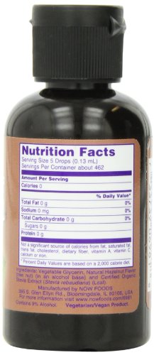 -. Binding : Grocery -. Brand : Now Foods -. Department : Health and Beauty>Health and Wellness -. EAN : 0733739069818 -. Feature : GMP quality assured / Natural hazelnut flavor / No artificial ingredients / Vegetarian formula -. IsAutographed : 0 -. IsMemorabilia : 0 -. Label : NOW Foods -. LegalDisclaimer : This information is intended for your general knowledge only and is not substitute for professional medical advice or treatment for specific medical conditions. This information is not intended to diagnose, treat, cure or prevent any disease. Always seek the advice of your qualified physician or other health care provider with any questions you may have regarding a medical condition. Keep out of reach of children. -. Manufacturer : NOW Foods -. MPN : 6981 -. NumberOfItems : 1 -. PackageQuantity : 1 -. PartNumber : 6981 -. ProductGroup : Grocery -. ProductTypeName : GROCERY -. Publisher : NOW Foods -. Size : 2 oz -. Studio : NOW Foods -. Title : Now Foods Stevia Extract Liquid, Hazelnut Cream, 2 Ounce Bottle -. UPC : 733739069818