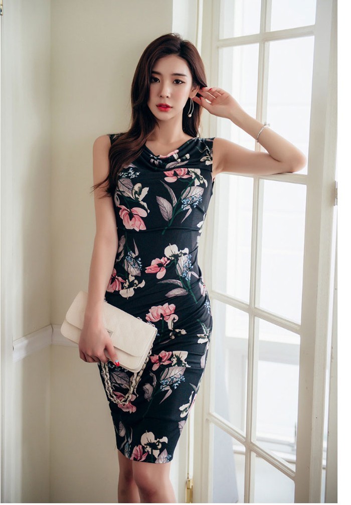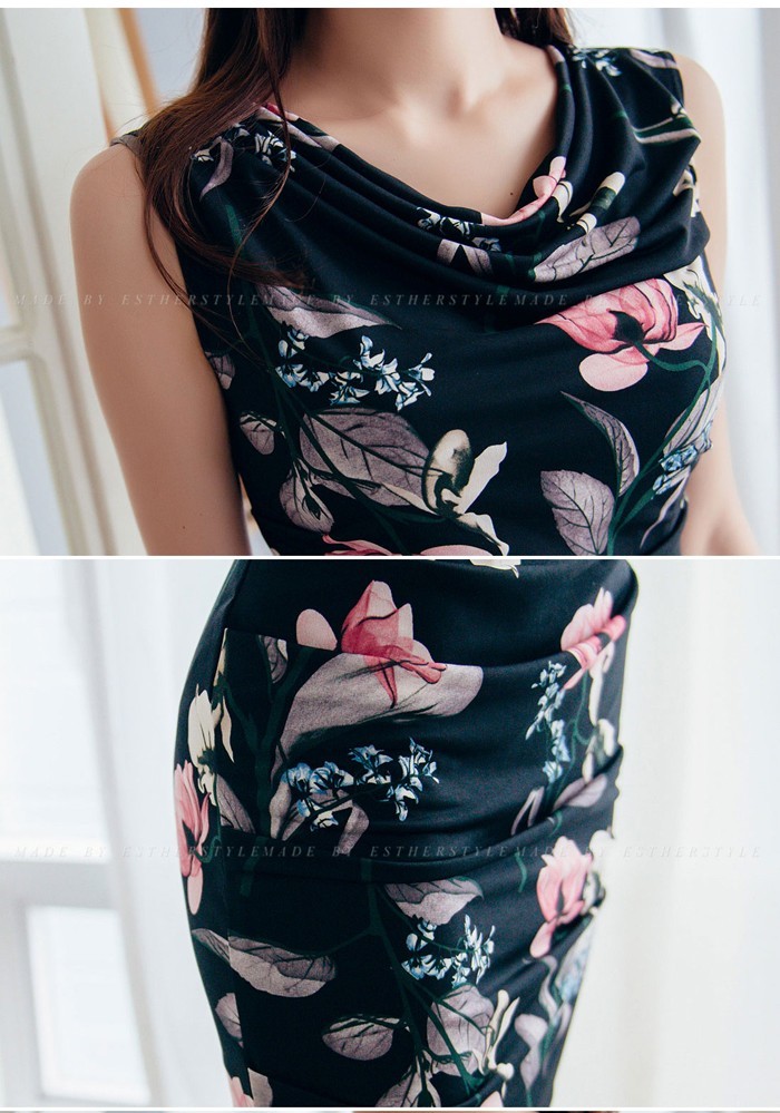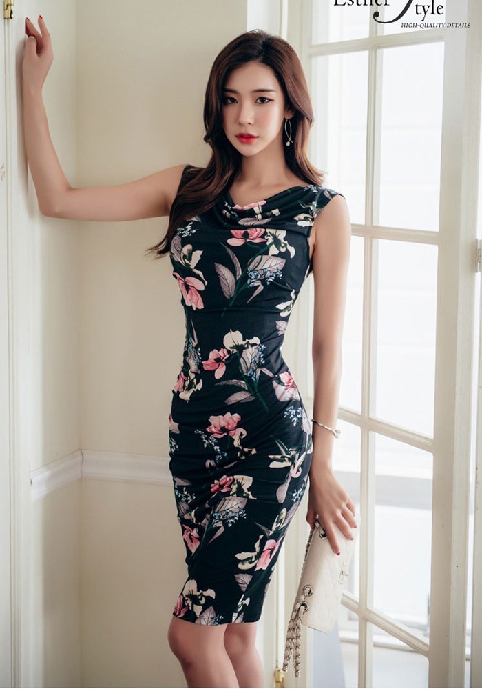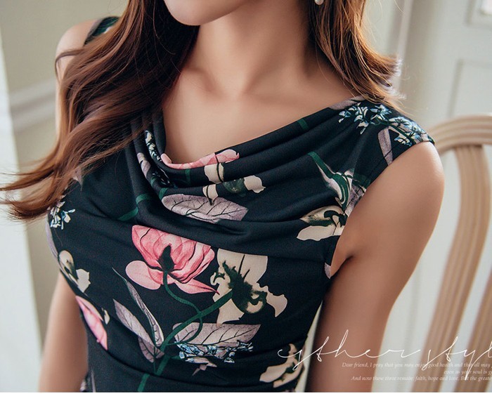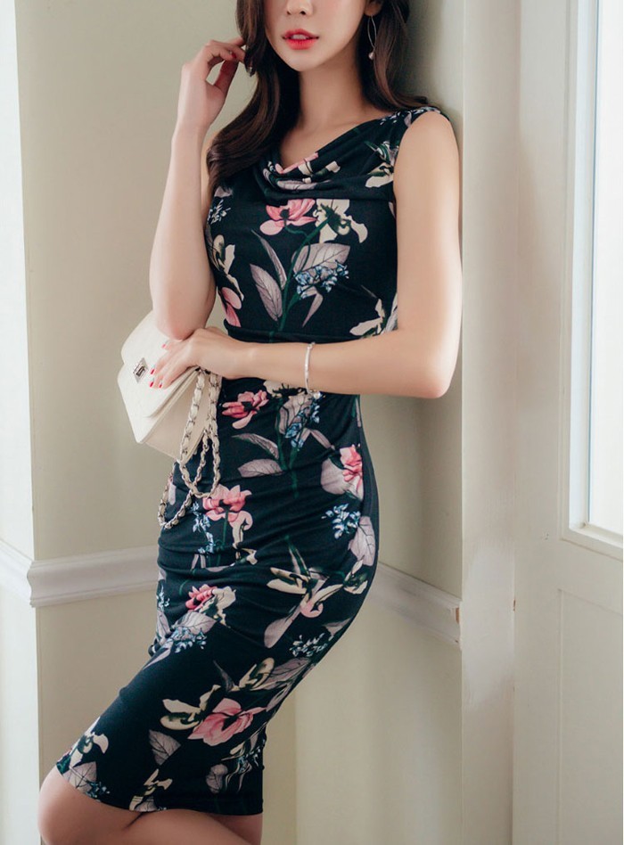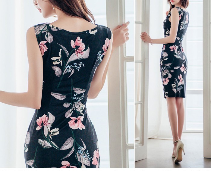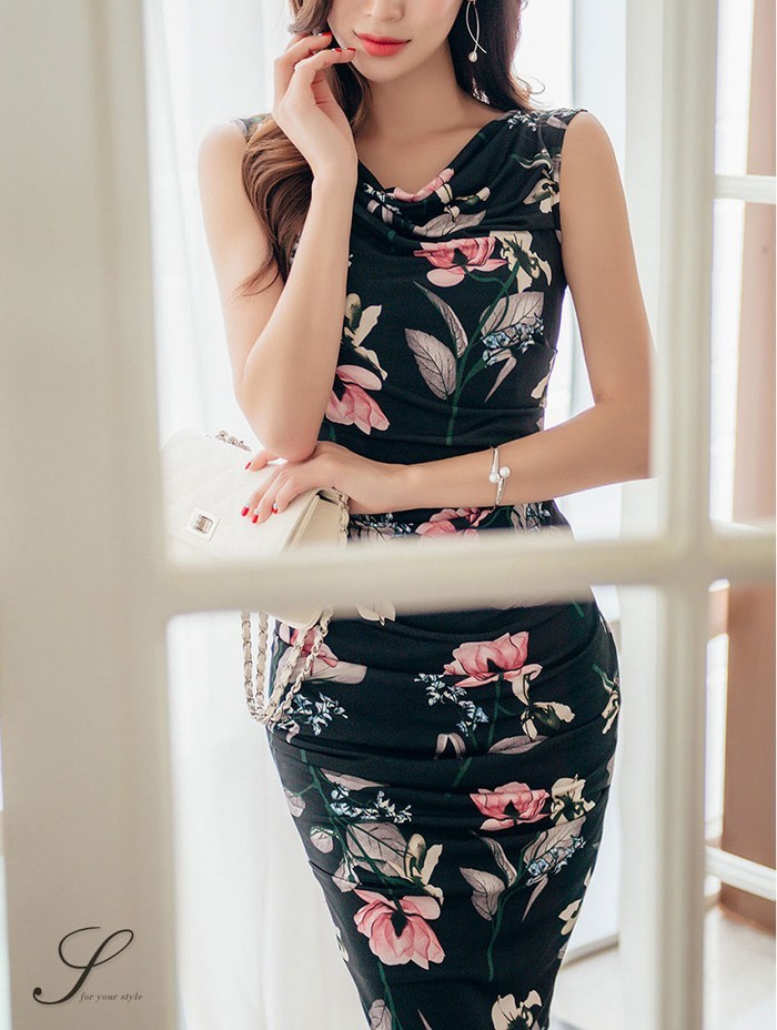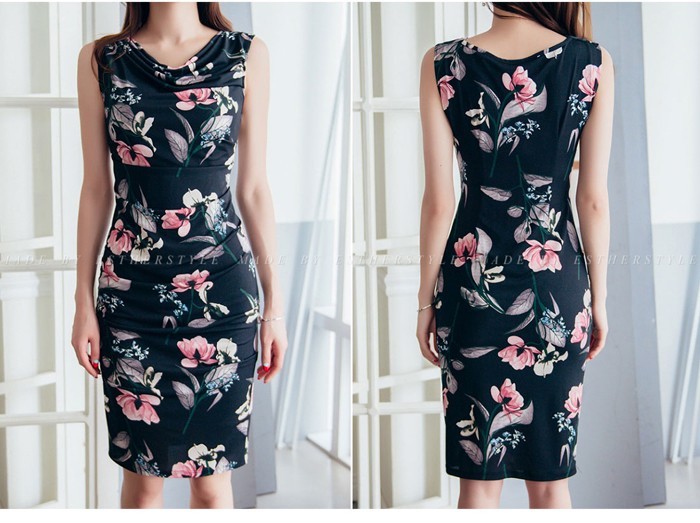 商品名:ワンピース ノースリーブ 花柄 フラワー 膝丈 タイトワンピ 服 きれいめ