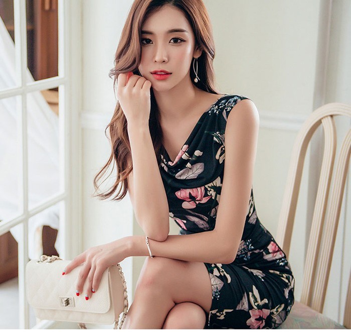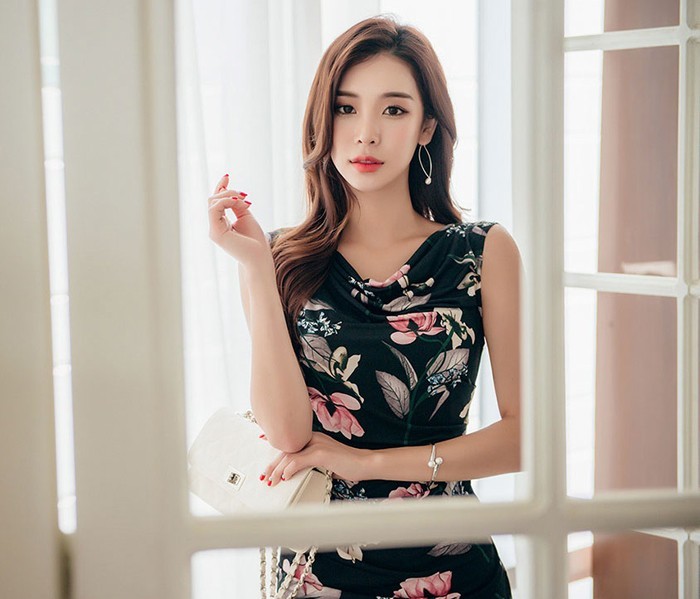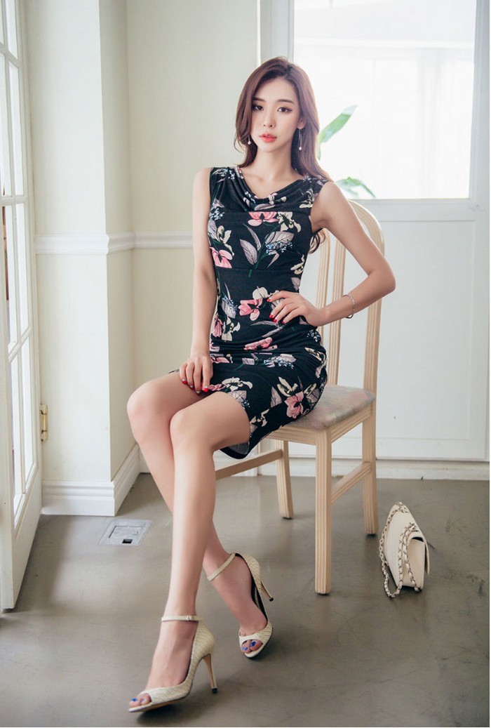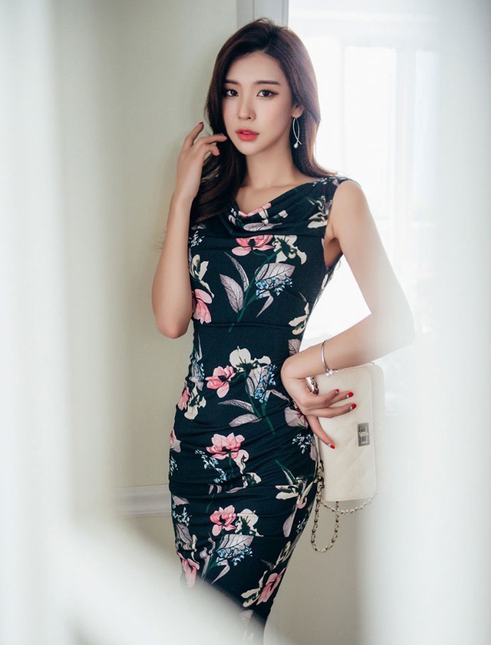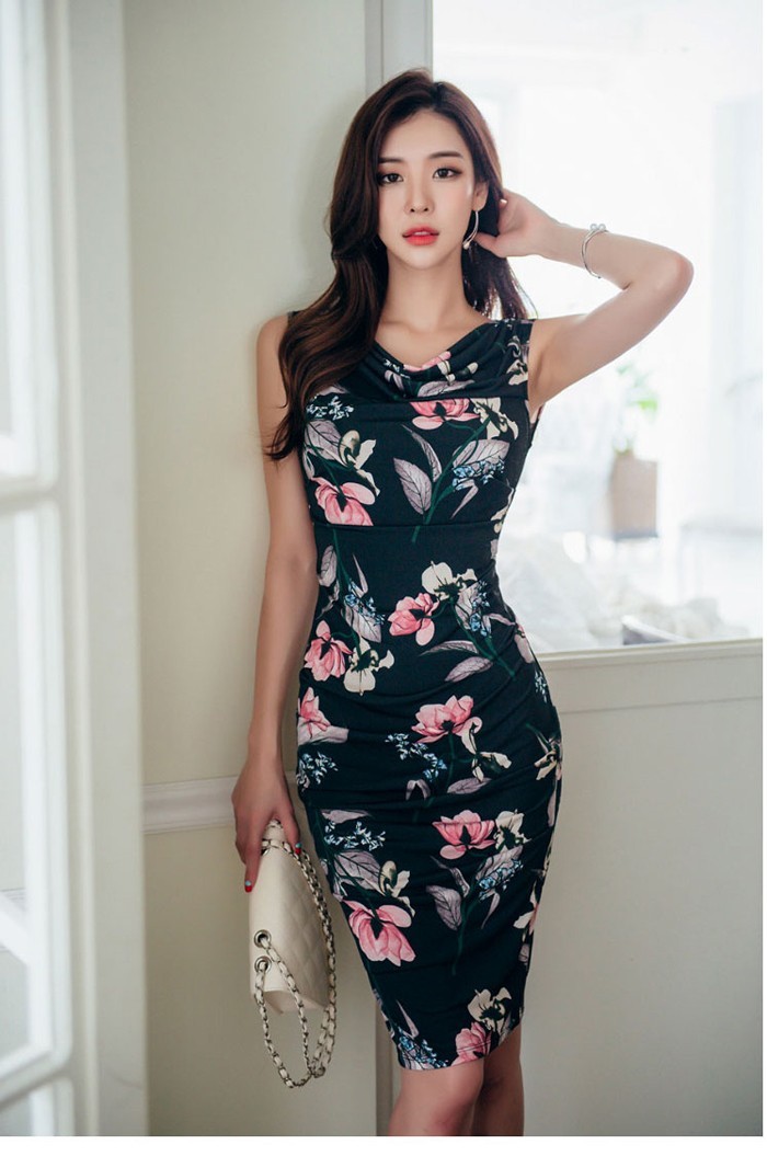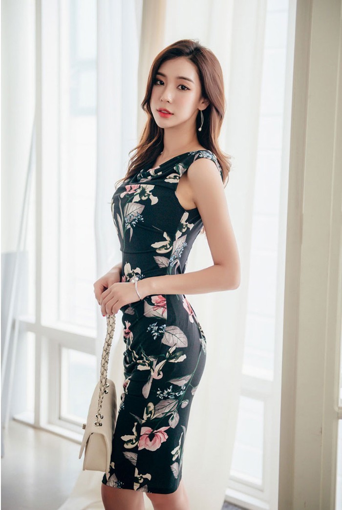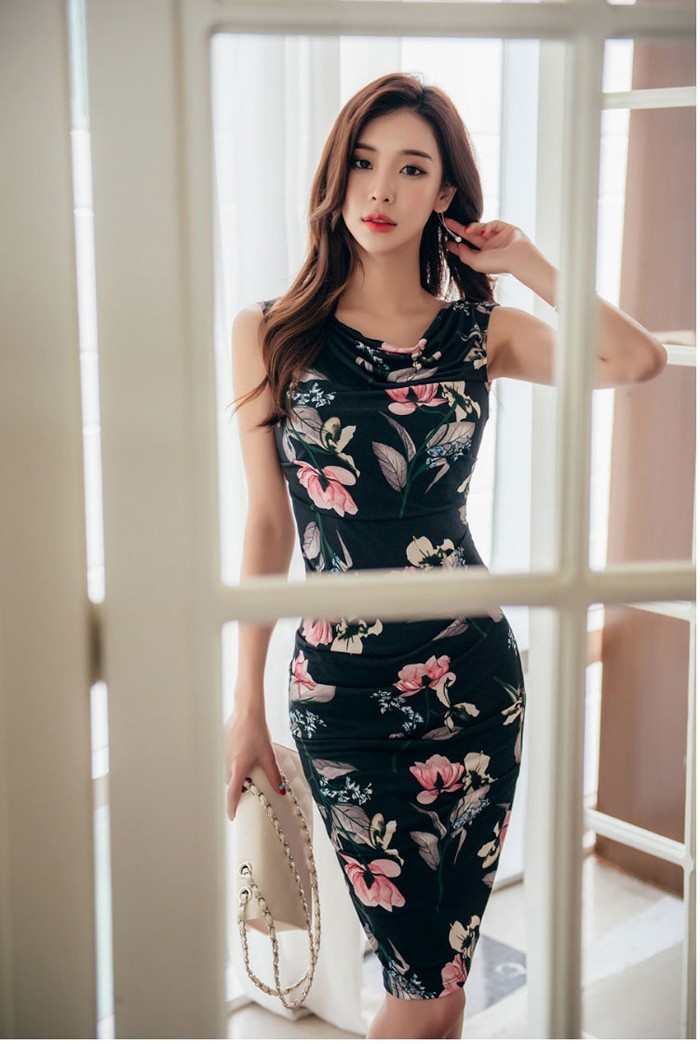 商品名:ワンピース ノースリーブ 花柄 フラワー 膝丈 タイトワンピ 服 きれいめ
