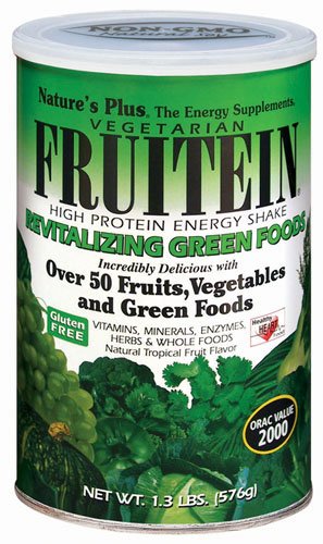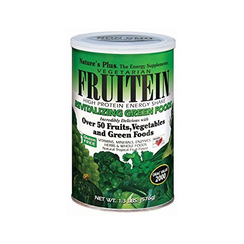 Studio : Nature's Plus Publisher : Nature's Plus Binding : Health and Beauty Product Description FRUITEIN® Revitalizing Green Foods Shake FRUITEIN® Revitalizing Green Foods Shake is an incredibly delicious, all-natural vegetarian blend of complete protein and complex carbohydrate ? supercharged with the amazing antioxidant power of nature's greatest green foods! Thick and creamy, instant-mixing FRUITEIN Revitalizing Green Foods delivers all the essential vitamins, minerals, and enzymes, and features the unique benefits of nutrient-rich green super foods like barley grass juice, green tea, algae, broccoli and spinach. Our powerful FRUITEIN Revitalizing Green Foods formula is fortified with a highly nutritious whole food and herbal base, including spirulina, Spanish bee pollen, fresh fruits and vegetables, young barley leaf, Korean ginseng and lecithin to form an amazingly energizing shake. Each delicious tropical fruit flavored serving of FRUITEIN Revitalizing Green Foods is enhanced with Activessence®, a patented enzyme activation system 0