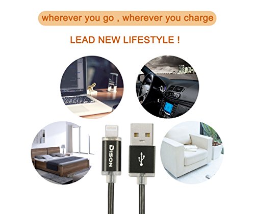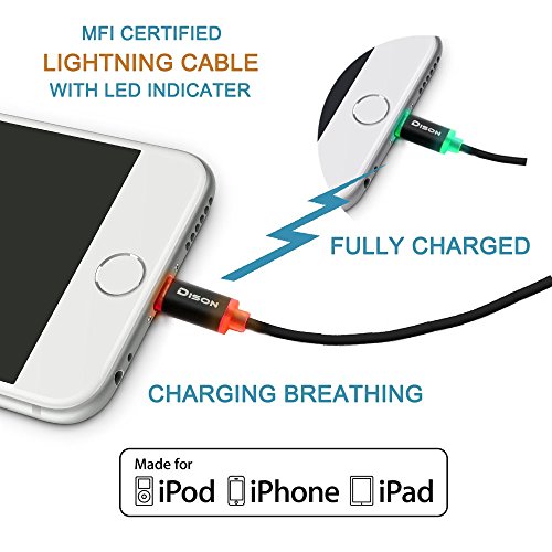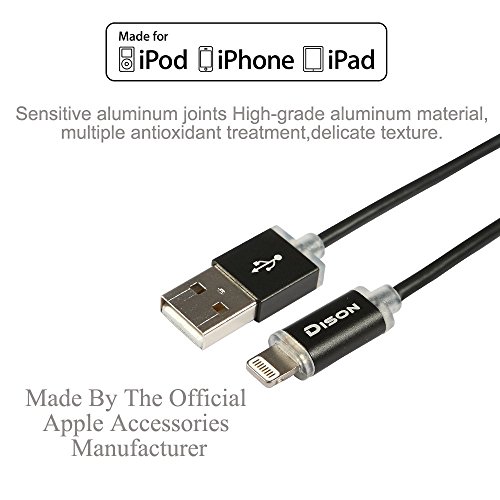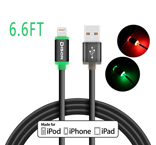 Apple Lightning Cable, Dison (6.6FT) Smart LED Flashlight Apple MFi Certified Lightning Cable, Built- in LED in Lightning connector to Aluminum USB Charger Cable for iphone 7/ 7 plus and iOS (Black)
