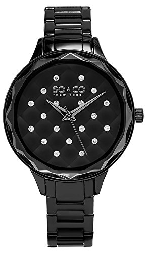 -. Binding : Watch -. Brand : SO&CO New York -. Color : Black -. Department : womens -. EAN : 0847988087414 -. Feature : Black stainless steel polished beveled bezel with black quilted design crystal accented dial / 38mm round case on a black stainless steel link bracelet with push button deployment clasp / Japanese-quartz Movement / Case Diameter: 38mm / Water Resistant To 50m (165ft: in General, Suitable for Short Periods Of Recreational Swimming, but not Diving or Snorkeling -. Label : SO&CO MFG -. Manufacturer : SO&CO MFG -. Model : 5255.2 -. MPN : 5255.2 -. PackageQuantity : 1 -. PartNumber : 5255.2 -. ProductGroup : Watch -. ProductTypeName : WATCH -. Publisher : SO&CO MFG -. Studio : SO&CO MFG -. Title : SO&CO New York Women's 'Madison' Quartz Metal and Stainless Steel Dress Watch, Color:Black (Model: 5255.2) -. UPC : 847988087414