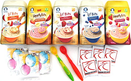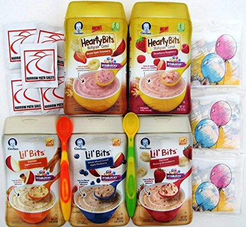 Gerber Baby Cereal Variety Pack + 2 Soft Tipped Infant Spoons of Good Quality (colors will vary) + 3 Disposable Food Catcher Bibs and 5 Sanitizing Hand Wipes exclusively from Narrow Path Sales. 3 Lil Bits + 2 Hearty Bits. 1 of Each Flavor, 5 Total. Gerber Lil' Bits Baby Cereals: Oatmeal Banana Strawberry, Whole Wheat Apple Blueberry, Oatmeal Apple Cinnamon. Gerber Hearty Bits Baby Cereals: Multigrain Strawberry Raspberry, Multigrain Banana Apple Strawberry. As babies begin the solid food journey, Gerber cereals with DHA are a great way to continue providing this important omega 3 fatty acid. DHA, naturally found in breast milk and many infant formulas, helps support brain and eye development. Gerber Cereals with DHA are made with natural grains, contain 18 milligram of DHA per serving and have all the great nutrition of other Gerber cereals (including iron, zinc and 6 B vitamins).Feature