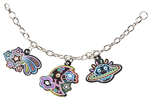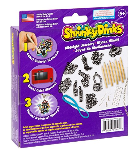 Shrinky Dinks Midnight Jewelry is an excellent way to spend a day indoors! Color, bake and shrink with special black plastic Shrinky Dinks. Make fabulous charms, necklaces and earrings. Shrinky Dinks sheets are made of a special thin, flexible plastic which, when heated in an oven, shrink and harden without altering their color or shape. We precut all the fun shapes in every one of our kits to make them easy to work with! Includes 10 preprinted and precut Shrinky Dinks, chain bracelet, 2 earring hooks, 10 jump rings, elastic loop and easy instructions. Recommended for children 5 years of age and older.Feature