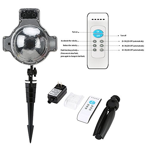 - 【Multi-Functional Unctiona Remote Controller (Battery Included)】 Button "F"-- Flash Setting, Strobe or Normal Mode can be applied to Led Flurries Lights. Lighting Mode. Button "S+/S-" for Speed Up/Down. Button "2/4/6H" for Timer, Sets the waterproof garden projector light on a 2/4/6 Hours on, 22/20/18 Hours off Daily Cycle.