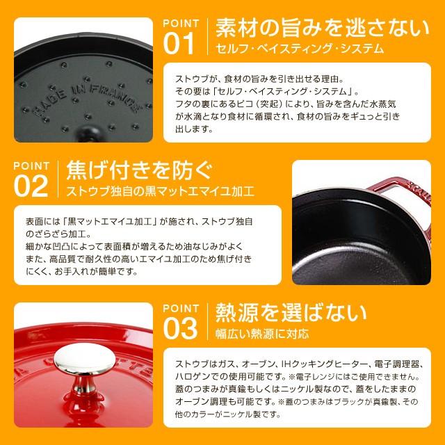 | 商品詳細 | 【取扱いについて】 ※電子レンジにはご使用できません。 ※取手が熱くなりますので、ご注意ください。 ※空焚きは本体のキズ・変形・変色の原因となりますので、絶対におやめください。 ※急冷、急加熱をしないでください。特にIH調理器をお使いの場合は急加熱にご注意ください。 ※水につける時は必ず15分以上冷ましてからつけてください。 ※金属タワシや研磨剤などは傷が付く原因になりますので使用しないで下さい。 ※サビの発生を防ぐため、洗ったら必ず水分を拭き取って下さい。 ● STAUB(ストウブ) お料理が楽しくなっちゃう!?ストウブからピコ・ココットラウンドの登場です。煮込みなど日常使いで大活躍!伝統あるデザイン性やオシャレなカラーリングは、キッチン・食卓を華やかに彩ります♪ | ||