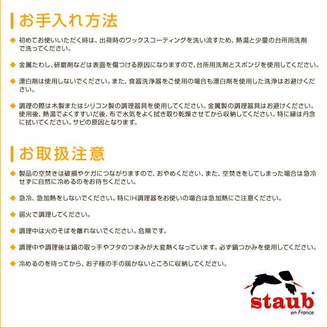 | 素材 | 鋳物ホーロー 【原産国】フランス ※生産国についてはその他諸外国にて生産している場合がございます。商品は混在して管理しております為原産国の種類はお選びできかねます。予めご了承下さい。 | ||