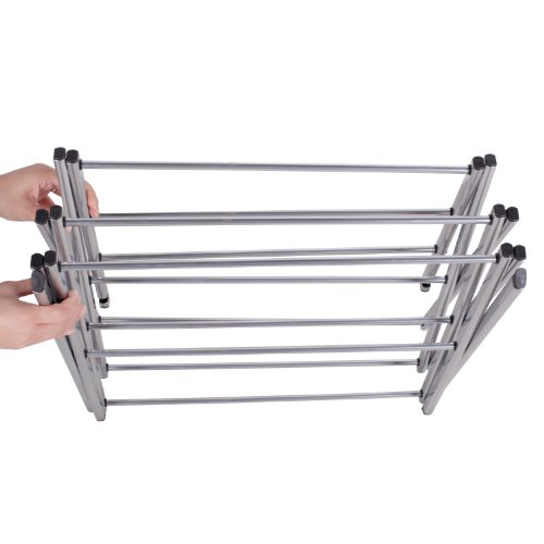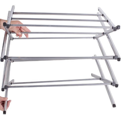 - Feature : 3-tier drying rack for saving electricity and helping clothes last / 11 steel drying rods offering 20 feet of drying space / Top shelf for sweaters or other flat-drying items / Constructed from strong steel with a water-resistant, shiny silver grey finish / Lightweight and easy to drop into position for use; folds flat for storage