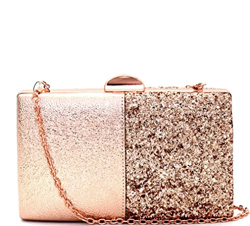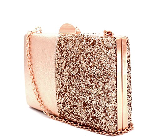 Chain shoulder strap included Faux-leather metallic material on one Side, Heavy Shiny Glitter on other side Rose-Gold hardware Closure - Push Lock Dust Cover