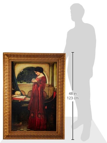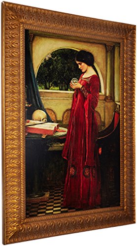 With book and skull tableside, this raven-haired beauty in her red velvet gown conjures not only a spell from her crystal ball, but the rich mystery and magic of the entire Victorian era. This beloved work by Waterhouse, chief of England's Pre-Raphaelite painters, once presided proudly over the dining hall at Glenborrodale Castle in Highland, England. The authentic stretched canvas replica painting captures the original work's texture, depth of color, and even its subtle brushstrokes, which are applied by hand exclusively for Design Toscano. The imported, delicately carved hardwood frame boasts a delicate leaf motif with fine feathered detailing finished in antique gold tones. Large: 28and 1/2"Wx39and 1/2"H.Feature