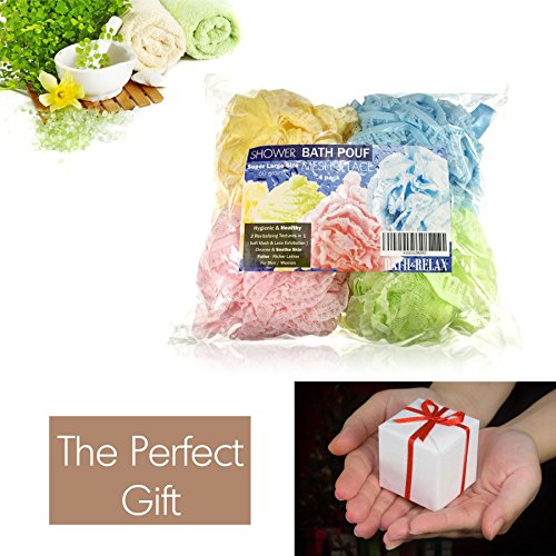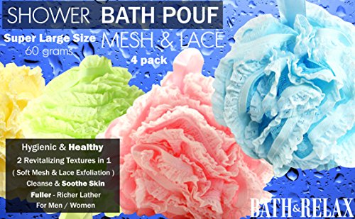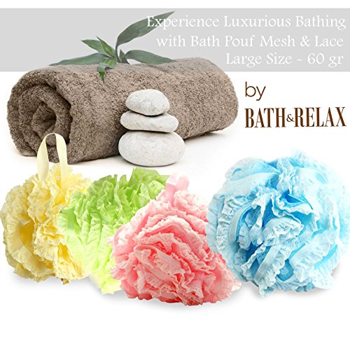 Bath Pouf Large Mesh & Lace Trim Shower Sponge Set of 4 Pack 60gr, Exfoliating Cleanse Soothe Skin Loofah Luffa Body puff Mesh Exfoliate Skin Lofah...