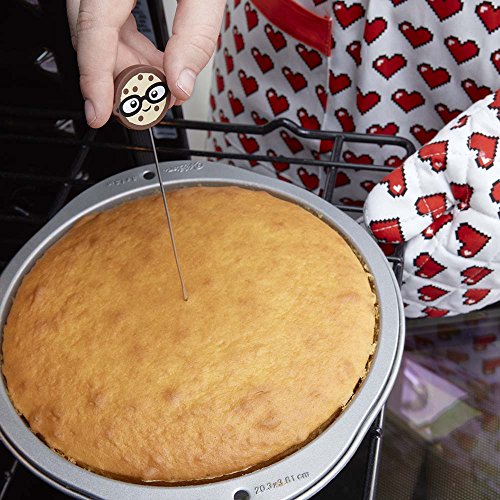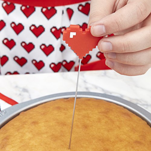 Long metal stick on cake testers keeps hands away from hot pan. Two testers included; one features the Nerdy Nummies logo, the other features an 8-bit heart design