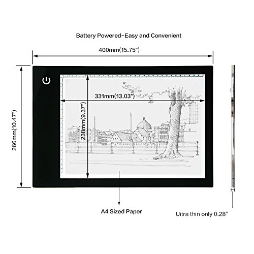 A4 LED Battery Powered Artcraft Tracing Light Pad-3-level adjustable brightness( Light Box) Description: - This Artcraft tracing light pad is a sleek light-up pad, the light from the pad through the paper clearly illuminates the images, which maketracing images become easy. - Suitable for any pen or pencil - Thin Portable design.Tracing light box is super thin and the acrylic surface makes it feel like a glass panel. - Amazingly slim, easy to operate, bright, You can take it anywhere with you easily unlike a traditional light box - Battery Powered,This drawing light pad's power supply by battery,Wireless Mode with Built-in Battery - Equip with touch sensor allow the control become easier, no matter turn on/off or adjust the brightness, simply handle with slight touch - Professional Copy in Animation,Cartoon,Tattoo TRACING,Craft Projects, Photograph,Flim,Slider Tracing in Indoor,Architecture,Design and Drawing,X-ray viewing etc Specification: 1.Material: Acrylic 2.Dimension: (LxWxH) 400mm x 266mm x 7.5mm (15.73*14.46*0.28Inch) 3.Active Area: 13x9.35 inches / 33x23.8 cm 4.Thickness:7.2mm(0.28inch) 5.Working Voltage: DC 5V 1600 mAh lithium battery 6.Cable length:4.9ft / 1.5 m 7.Net weight: 2.4 pound 8.Rate Power:5W Package include: 1X LED tracing light pad 1X USB adapter 1X cable 1X pencil(as gift) 1X Pencil sharpener(as gift) 1X Hand bag(as gift) 0 |