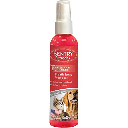 -. Binding : Misc. -. Brand : Sentry Industries Inc. -. EAN : 0884953944525 -. Feature : SENTRY Petrodex Breath Spray Cats & Dogs (4 oz) is an easy and effective way to give your pet a healthy mouth. / The gentle spray soothes irritated gums while preventing plaque and killing the bacteria that cause bad breath. -. Label : SENTRY -. Manufacturer : SENTRY -. PackageQuantity : 1 -. ProductGroup : Pet Products -. ProductTypeName : PET_SUPPLIES -. Publisher : SENTRY -. Studio : SENTRY -. Title : SENTRY Petrodex Breath Spray Cats & Dogs 4 oz -. UPC : 884953944525