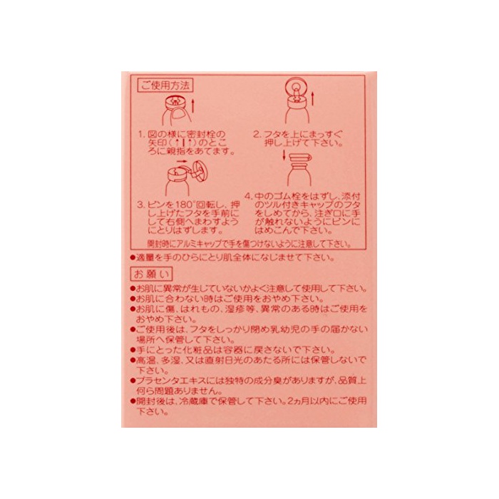 배합 성분수,프라센타(태반) 엑기스(돼지 유래)고, 히알론산Na,《벤지렌구리코루》,회 노《기시에타노루》,메칠파라벤