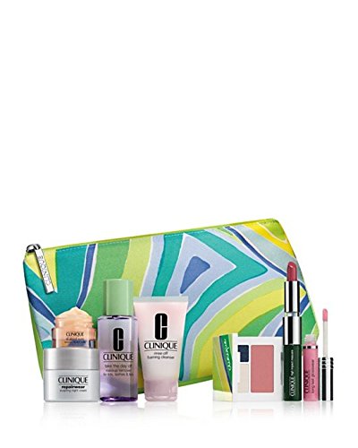 -. Feature : Value Set includes / All About Eyes (0.21 oz.), Repairwear Sculpting Night Cream (0.5 oz.) / Take the Day Off Makeup Remover (0.5 oz.), Rinse-Off Foaming Cleanser (1 oz.) / Compact with All About Shadow Duo in colors from Wave After Wave and Smoke and Mirrors plus a Soft-Pressed Powder Blusher in Cupid, Dual-End Different Lipstick in Raspberry Glace and High Impact Mascara in Black / Long Last Glosswear in First Date, Green Printed Cosmetics Bag