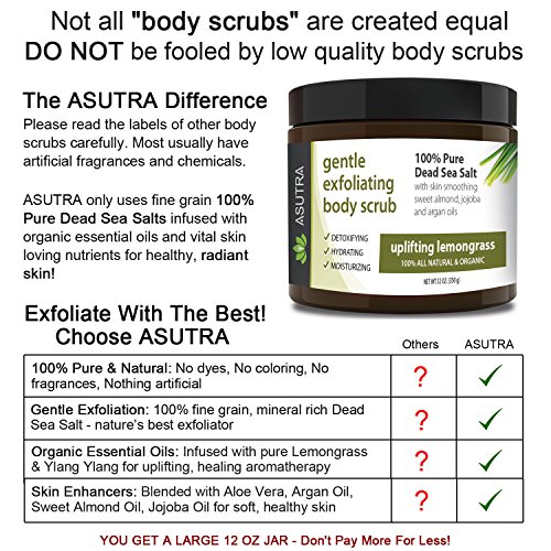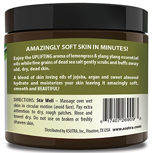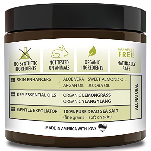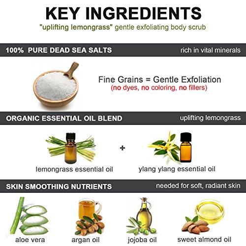 Best ORGANIC Exfoliating Body Scrub -"UPLIFTING LEMONGRASS" 100% Pure Dead Sea Salt Scrub / Ultra Hydrating & Moisturizing with SKIN SMOOTHING Jojoba, Sweet Almond & Argan Oils - 12oz