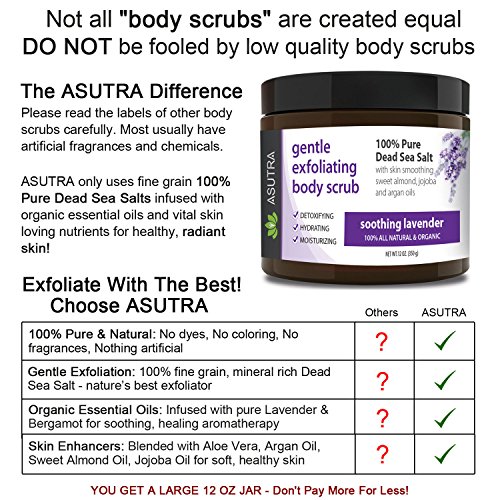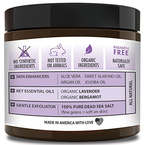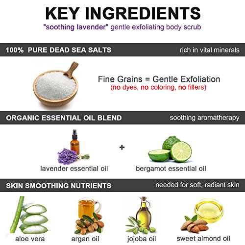 Best ORGANIC Exfoliating Body Scrub - "SOOTHING LAVENDER" - 100% Pure Dead Sea Salt Scrub / Ultra Hydrating & Moisturizing with SKIN SMOOTHING Jojoba, Sweet Almond & Argan Oils - 12oz