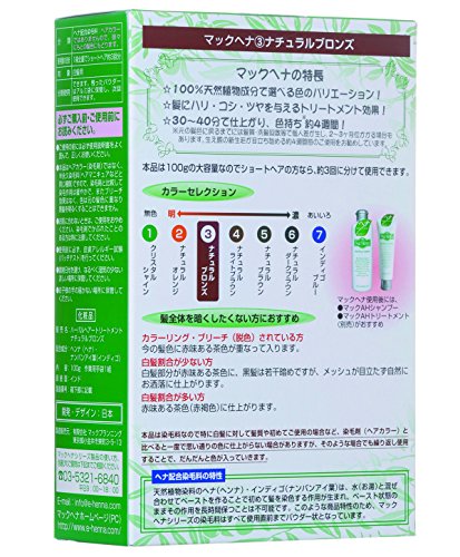 髪・地肌を傷めずカラーリングできる、天然植物成分100%のマックヘナパウダー、不純物を含まない高品質原料のみ使用し、400メッシュのきめ細かいパウダーだから、仕上がり時間も40分とスピーディ。ヘナに同じ天然ハーブのインディゴを配合し、色は少な目の白髪を自然にカバーするカッパー系のナチュラルブロンズ。