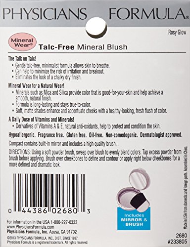 Studio : Physicians Formula Inc Publisher : Physicians Formula Inc Binding : Misc. Product Description For extra sensitive or breakout prone skin! Ultra-smooth, natural looking color. Minimalist formula helps reduce irritation and breakout. Includes built-in-mirror brush! Hypoallergenic. Fragrance free. Dermatologist approved. The Talk on Talc! While most powders blush formulas contain talc as their main ingredient, this minimalist talc-free formula was specially developed for the most sensitive and or breakout-prone skin. For extra sensitive skin, less is more, less ingredients that is. This gentle formula allows skin to breathe and can help to minimize the risk of irritation and breakout. Mineral Wear for a Natural Wear! Minerals provide color that is good-for-your-skin and help achieve soft, sheer shades for a smooth, natural finish. Mineral Wear Blush is long lasting and stays true-to-color. A Daily Dose of Vitamins and Minerals! This good-for-your-skin powder blush would not be complete without a healthy dose of vitamins. In addition to the minerals, Mineral Wear contains derivatives of Vitamins A E, natural anti-oxidants which help to protect and condition the skin. The silky formula sweeps on effortlessly to create natural look. Soft, matte shades enhance and accentuate cheekbones with a healthy looking, fresh flush of color. Hypoallergenic. Fragrance free. Non-comedogenic. Dermatologist approved. Oil free. Made in the USA from domestic and foreign parts. 0
