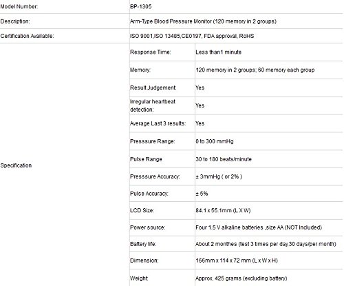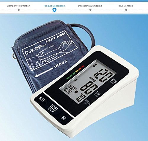-. Feature : Automatic Inflation , Jumbo LCD Display, Regular Cuff, 22-36cm , 8.5-14 inch / Irregular Heart Beat Detection ,120 Memories in 2 Groups. Last 3 Results Average / WHO Blood Pressure Classification Indicator, AC Adaptor Jack (AC ADAPTER NOT INCLUDED ), Low Battery Indicator. Auto Shut Off / FDA approved device. Deluxe carry case included for convenient carry and storage.Features a heart rate indicator and date and time indicator / 1-2days Delivery from san Francisco, USA wearhouse with USPS Free Shipping .You will receive it in about 1-3 days after we delivery your order.