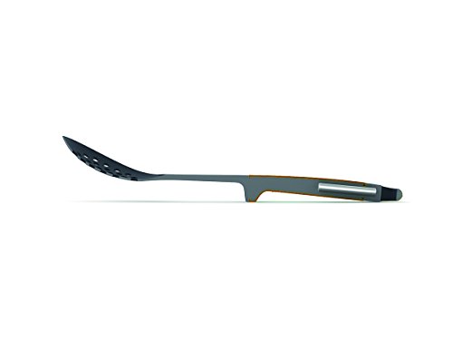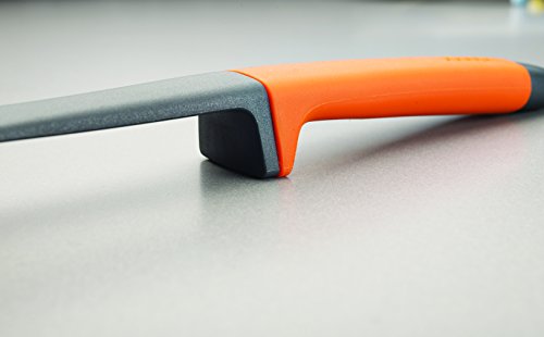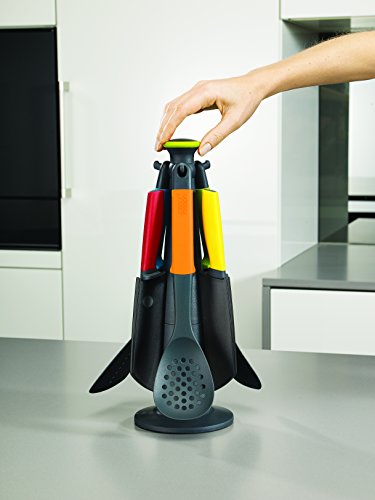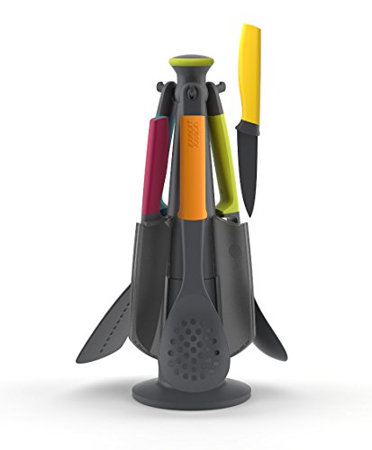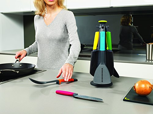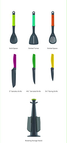 The Elevate Technology from Joseph Joseph prevents tool heads or blades from touching the work surface when placed down. The knives feature non-stick silicone-coated blades and easy-grip handles. The tool heads are suitable for use on non-stick cookware and are heat resistant up to 200 C / 392 F. The rotating storage stand has a non-slip base and features an easy-grip spindle top. Set includes: Big Turner, Slotted Spoon, Spoon, Paring Knife, Santuko Knife, Serrated Knife and Carousel.
