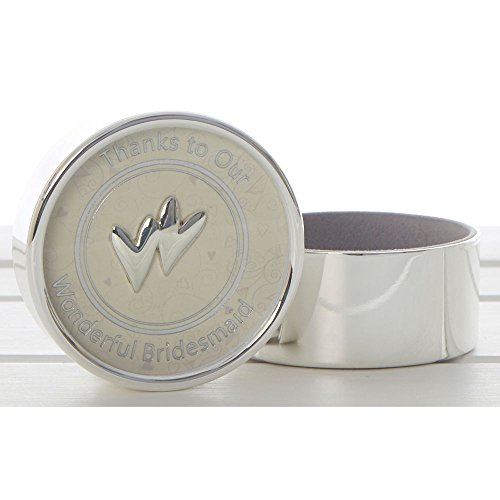 - Silver plated box with glossed ivory lid detail, including dimante illustration and classic silver font quote reading: "Thanks to Our Wonderful Bridesmaid".