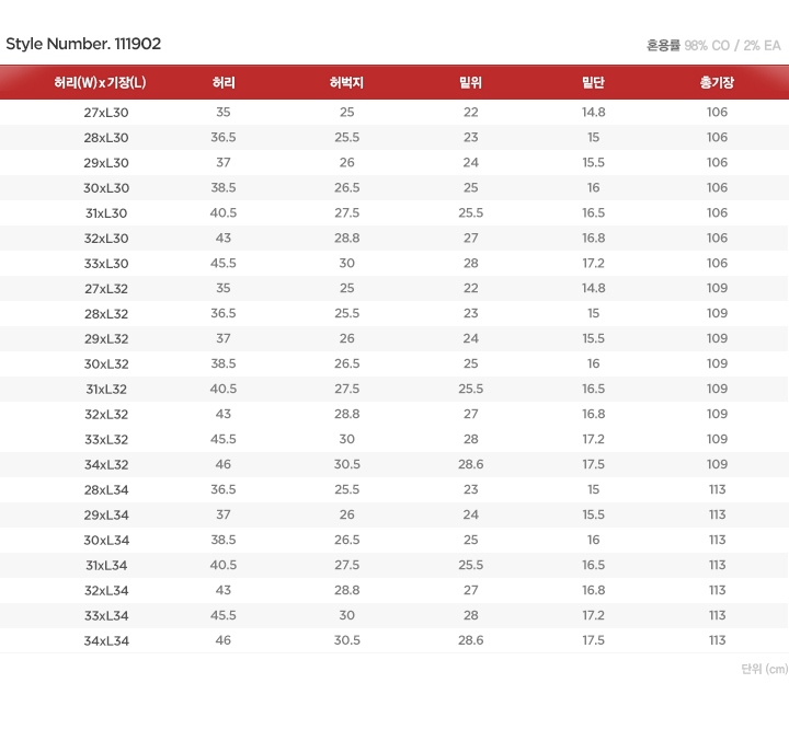 | 사이즈 | 27xL30,28xL30,29xL30,30xL30,31xL30,32xL30,33xL30,27xL32,28xL32,29xL32,30xL32,31xL32,32xL32,33xL32,34xL32,28xL34,29xL34,30xL34,31xL34,32xL34,33xL34,34xL34 |
