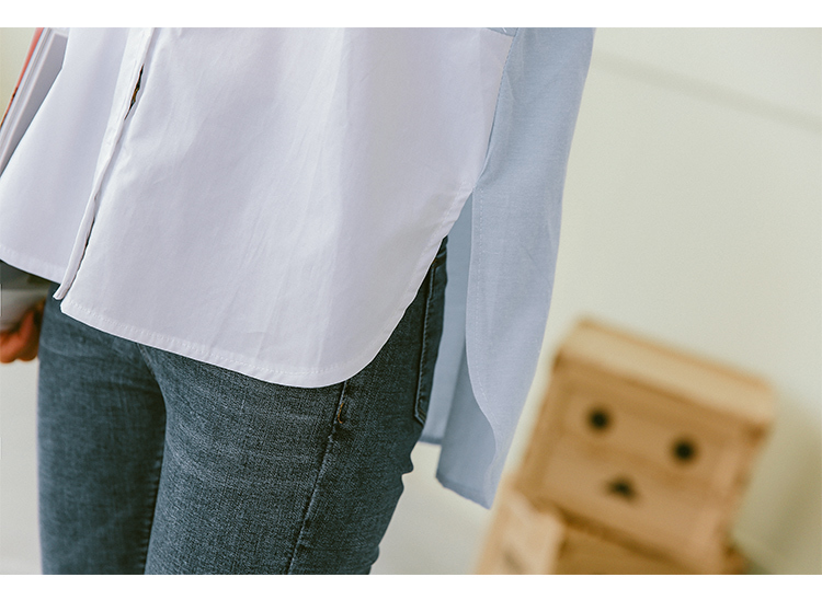 パッチワークのような生地の組み合わせがおしゃれで、春らしく爽やかな雰囲気の長袖ブラウスです。