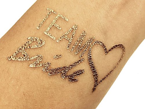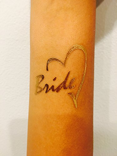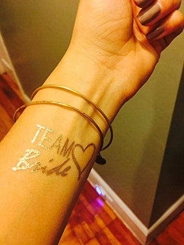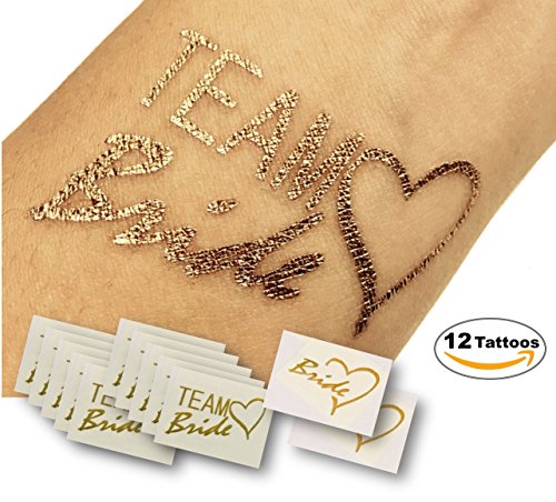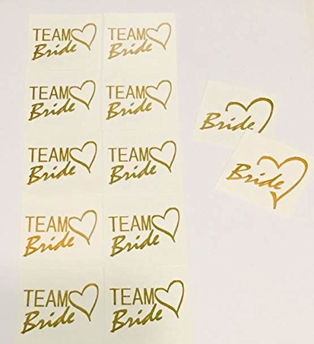 Enjoy your day or night of fun with your friends with these beautifully shimmery temporary tattoos. A trending staple for any bridal shower or bachelorette party. 12 pack includes: 2 - "Bride" tattoos and 10 -"Team Bride" tattoos. Beautiful gold color works well on different skin tones. When tattoos dry, they resemble a shimmery rose gold color. Be creative! Can be placed on wrists, shoulders, back of neck, etc.... Each tattoo measures 2" x 2". Having fun in the sun for your bachelorette party? Our high quality tattoos can be used in water and will last a few days if applied carefully following instructions indicated on the package.Feature