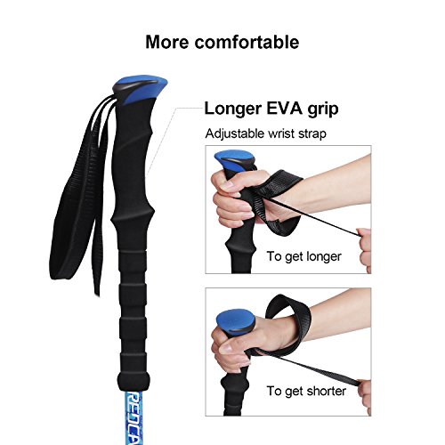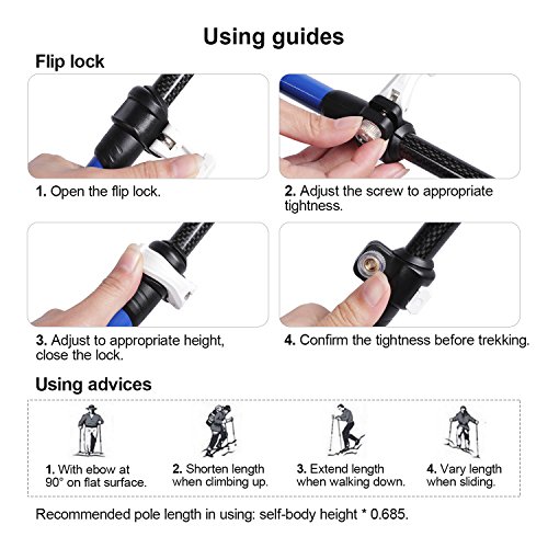 Easy Lock and Telescoping: With Quick Flip Lock, can be telescoping to adjust the poles length from 24.5 to 53 inches, which is suitable for each hiker from 5 to 7 feet tall.
