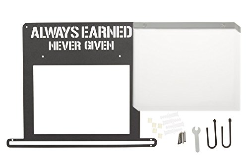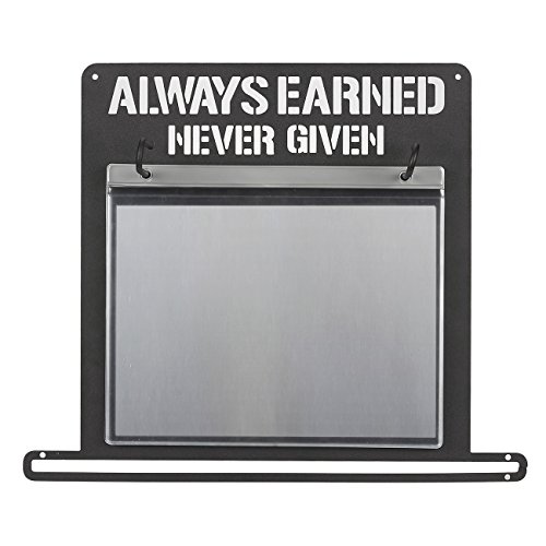 IRON BOARD: This wall-mounted iron medal display hanger features decorative hollow lettering and allows for the hanging of 12 medals or bibs. It spells "Always Earned Never Given"
