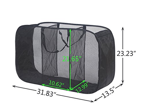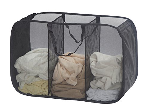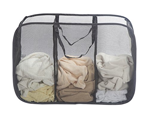 This Pop Up Triple Laundry Sorter Features 3 compartments to sort laundry by light dark clothes. It also features durable nylon mesh construction and a flexible wire frame that allows this heavy-duty laundry sorter to be folded flat for compact convenient storage. Holds several loads of laundry at a time. Convenient carrying handles for easy transportation. It can stands up and stays open.