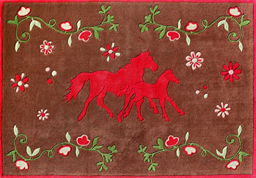 Brauner Kinderteppich mit zwei fuchsiafarbenen Pferden und Blütenranken aus handgetuftetem Acrylgarn nach Ökotex 100 schadstoffrei geprüft in verschiedenen Größen