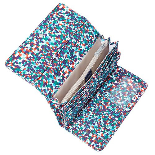 -. Feature : Nylon; Imported / Removable wristlet strap with chevron webbing / Snap closure / Six card slots and two compartments with center zip divider / ID window and three more card slots
