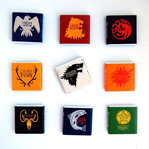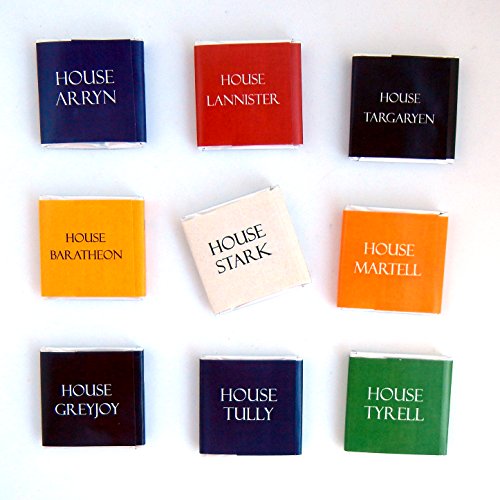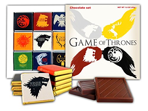 -. Feature : Gift set has a MAGNET on it's backside so you can hang it on your fridge. / 9 pieces of high-quality chocolate in a uniquely designed box. / Arrives ready to give in a creative carton box with sliding bottom. / Each of the 9 wrappers mottos of the Great Houses of Westeros: «Ours is the Fury», «Winter is coming», «Hear me roar» / «Growing strong», «We do not sow», «Family Duty Honor», «Fire and Blood», «Unbowed, unbent, unbroken», «As High as Honor»