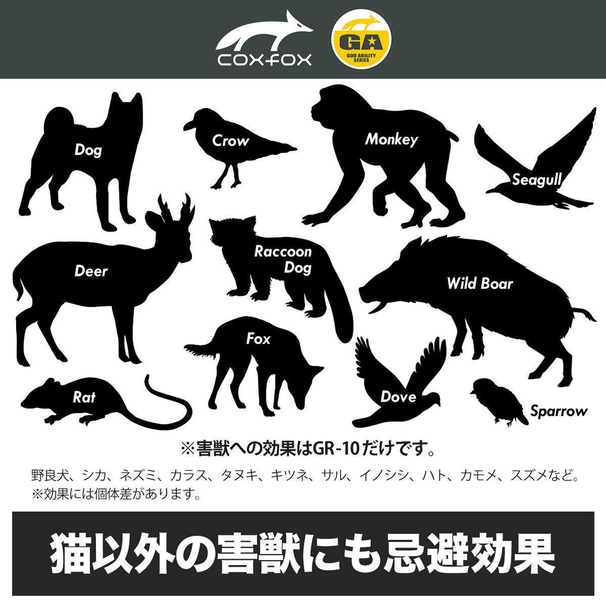 Animals such as stray dogs, deer, rats, crows, raccoons, foxes, monkeys, wild boars, pigeons, seagulls, sparrows, etc. are also effective.