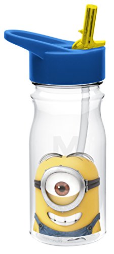 Keep your family hydrated with one of the minions from despicable me 2 on this Tritan water bottle by Zak designs. Made from durable Tritan plastic, this water bottle is shatterproof, break-resistant, durable and leak-proof. It has a handy built-in carrying loop and the easy-open, flip-up spout and detachable straw makes it easy to use and clean. The water bottle has a wide mouth opening that easily accommodates ice-cubes. This reusable bottle will last wash after wash; good for you and good for the environment. 16.5-ounce Capacity, BPA free and dishwasher safe, but do not microwave. By Zak designs, making mealtime fun.Feature