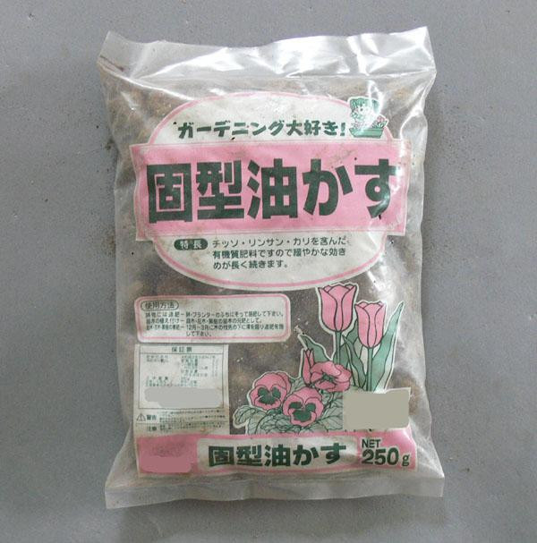 油粕に骨粉などを配合し、水で練り上げた後、粒状にして発酵させた、3要素のバランスの良い肥料です。土の表面に置くだけで、水やりと共に肥料分が溶けだします。株のまわりの数か所に置肥します。
