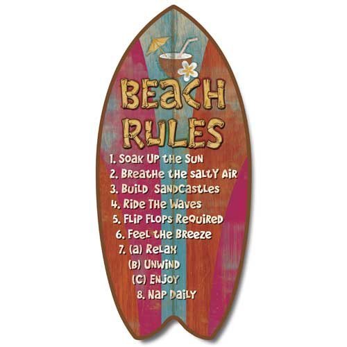 - The beach rules include 'soak up the sun, build sandcastles, ride the waves, etc.' This plaque would look great in a beach themed bedroom or bathroom.