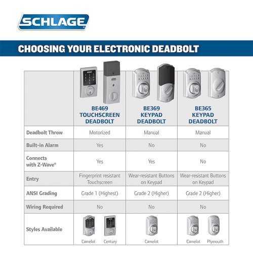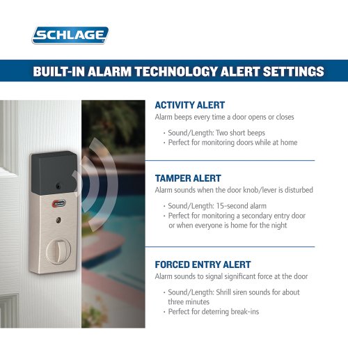 The Schlage BE469NX is BHMA/ANSI Grade 1 certified, the highest residential rating. Built from high quality materials, this keyless deadbolt gives you the highest level of security at the main point of entry. Additionally, the Schlage BE469NX door lock comes with a built-in audible alarm sensor that alerts you to activity at the door. You can select between 3 alert modes, activity, tamper, or forced entry, providing alerts from first contact with door or handle to when the door is opened. Quickly and easily cycle between the three settings simply by pressing a button on the lock.