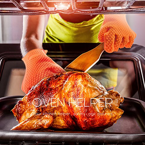 - Extreme Heat Resistant Oven Mitts up to 425° heat protection, Our BBQ gloves have designed to maximize your heat protection from open flames and oven temperatures with flexible, breathable and insulated silicone.